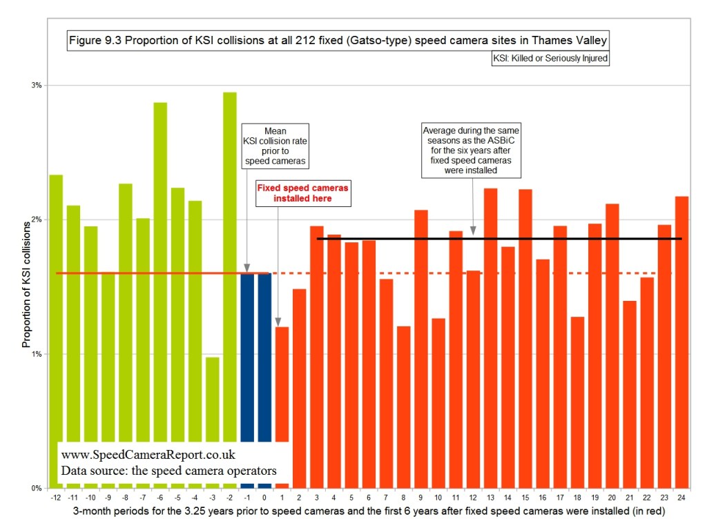 At the 74 most recent fixed speed camera sites in Thames Valley, there was an overall 43% reduction in KSI collisions and, at speed camera sites across Britain, there was a 42% reduction in KSI (10a).