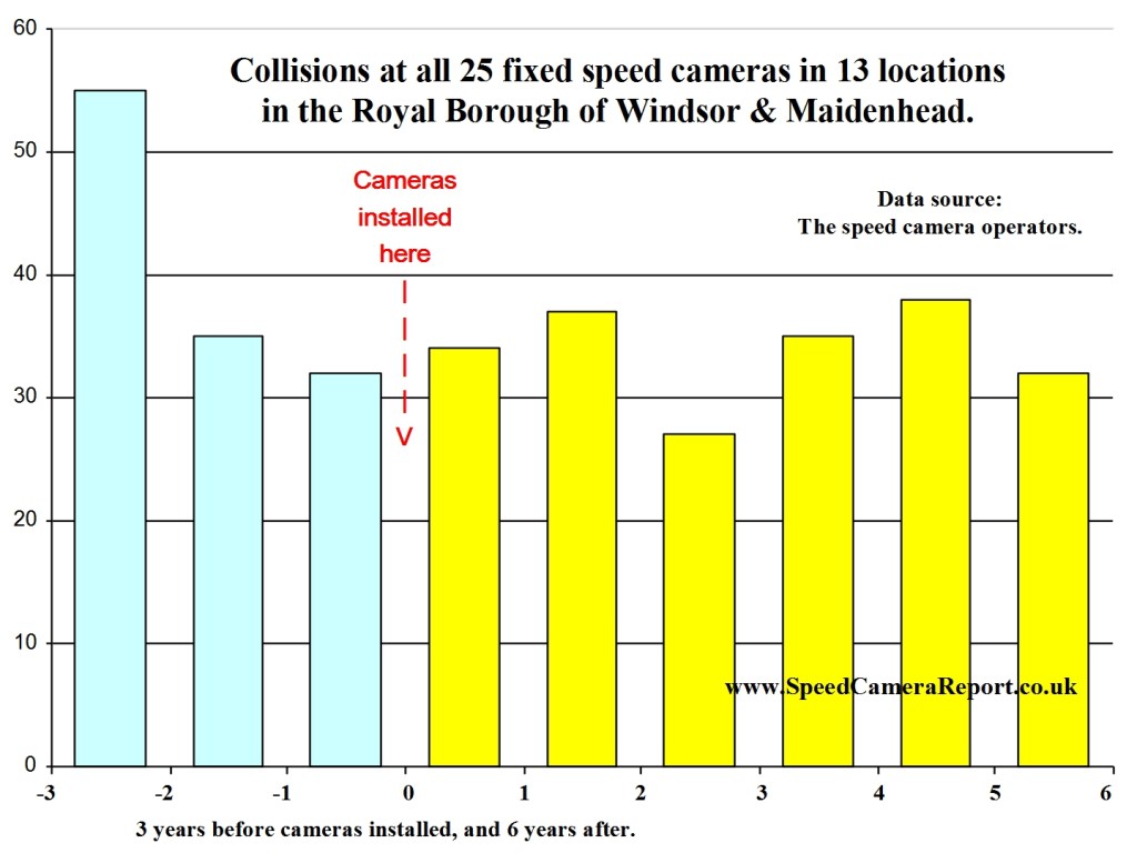In 2009, councillors in RBW&M were deciding whether to continue to pay £200,000 pa to the speed camera operators. They requested that I investigate the effectiveness of their 25 speed cameras at 13 locations.