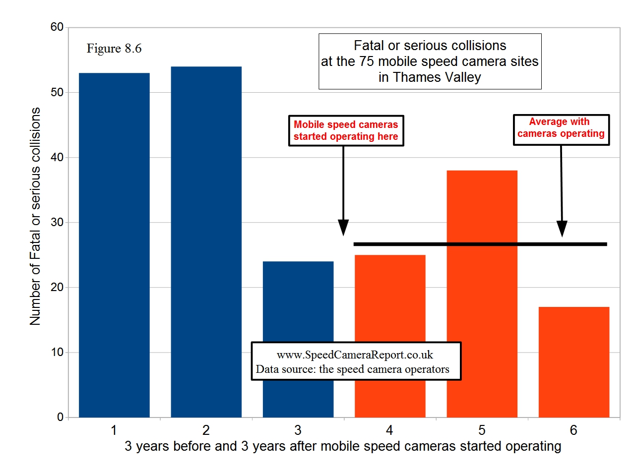 There was a 42% reduction in KSI (killed or seriously injured) at the 75 mobile speed camera sites in Thames Valley, but the entire reduction had already occurred a full year before the cameras started operating. The report concludes that the entire reduction was due to RTM, with the mobile speed cameras having provided no road safety benefit whatsoever. The final results compared the mean rates at the sites relative to all roads in Thames Valley before and after mobile speed cameras were deployed. There was: