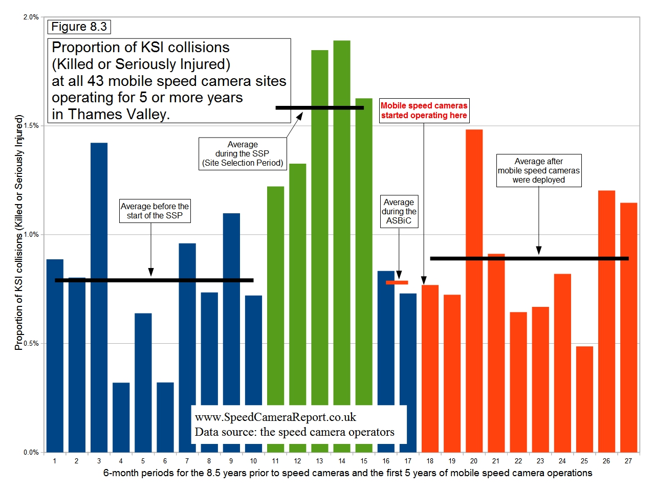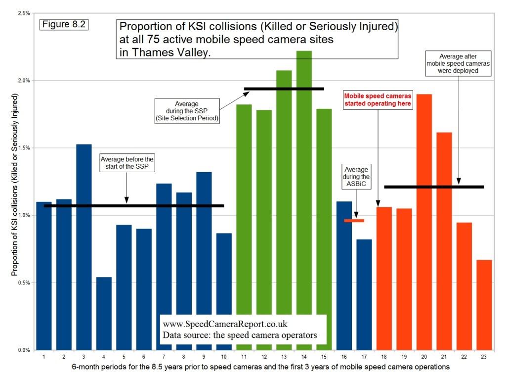 Figure 8.2 shows KSI collisions varying around the relative mean rate for the first 5 years (the PreSSP) and then the sites were selected after KSI collision rates were, on average, nearly double their relative mean level during the 2.5 year SSP. KSI collisions then returned to around the relative mean rate during the year prior to speed cameras (the ASBiC).
