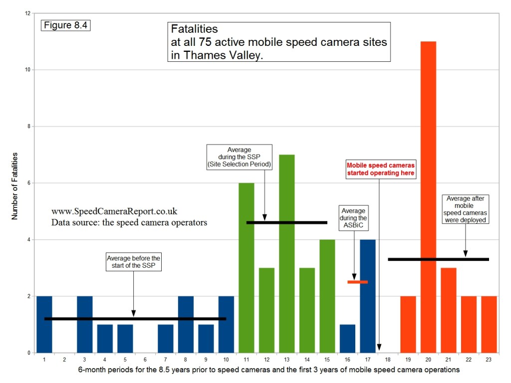 8.4.1 Random variations in relatively low numbers of collisions on each short stretch of road (such as a speed camera site) may result there being insufficient data to accurately determine the mean collision rate prior to a speed camera being deployed. Therefore evaluation of the effects of a speed camera at an individual site could be very unreliable. This problem can be overcome by considering a large group of sites where sufficient data does exist to accurately determine the mean collision rate for the group. This report evaluates as a group, all mobile speed camera sites in Thames Valley that were active at the start of 2009 and that had been operating for three or more years, a total of 75 sites.