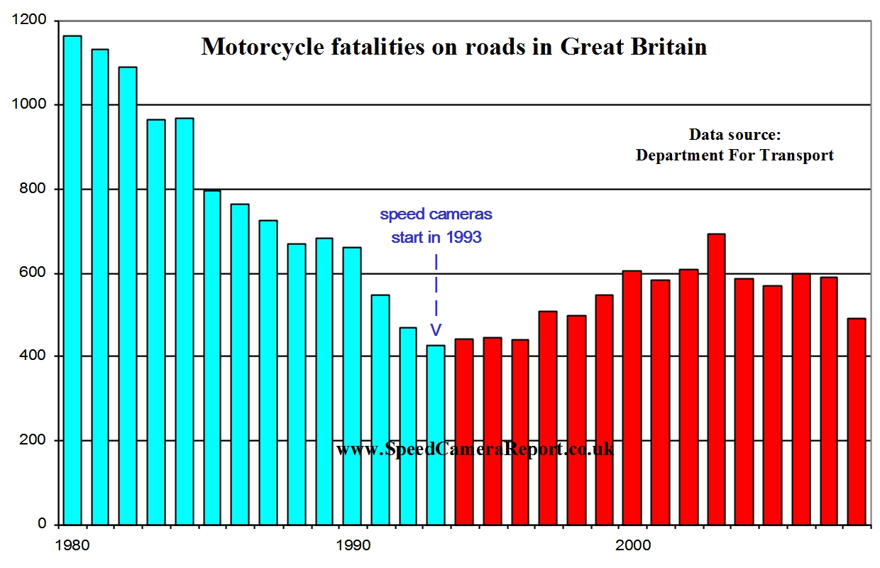 Note, deaths of motorcyclists fell to their lowest level in 1993 (the year speed cameras started) and then rose as the speed camera network expanded.
