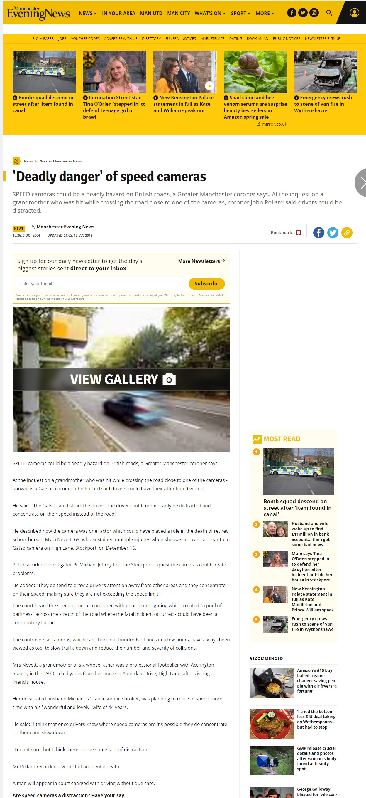 - A pedestrian was killed after a driver may have been distracted by a Gatso speed camera, according to the Coroner and the Police accident investigator (Manchester Evening News or ScreenShot).